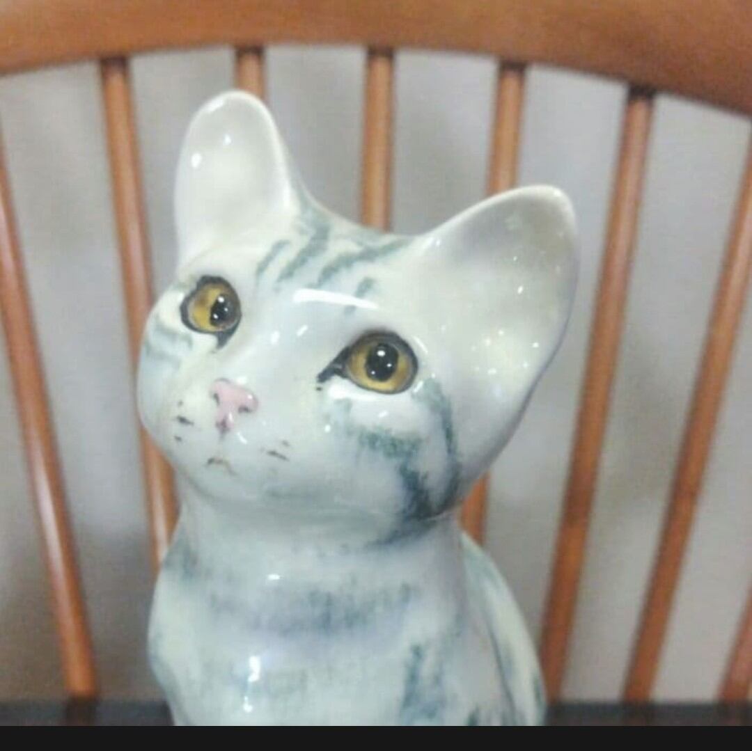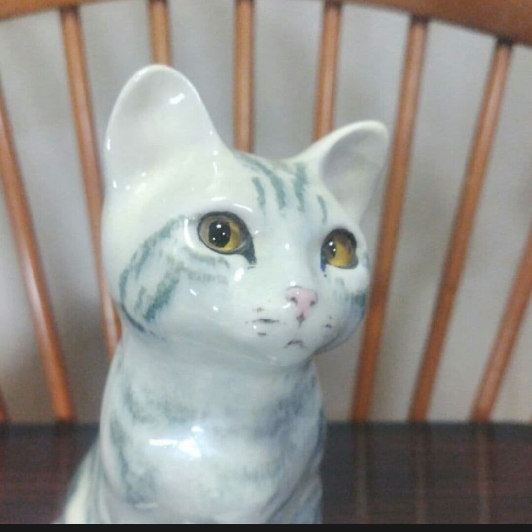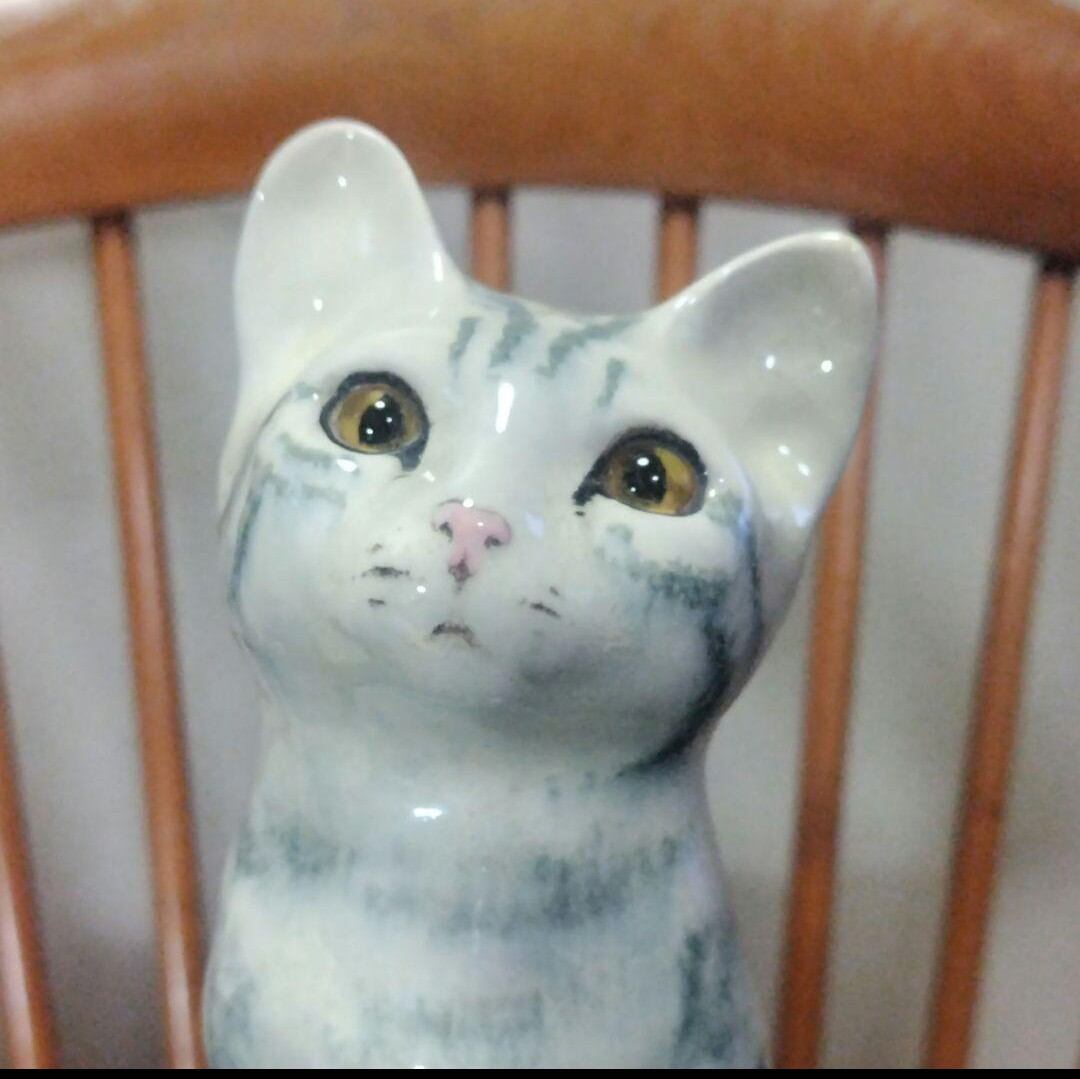 (ご参考)ウィンスタンレイ キャットの歴史〜彼女が猫を作り始めたのは、化学者でもある後の夫アレンの工房の助手に応募したのがきっかけでした。1950年代当初はケンジントン工房と呼ばれていましたが、ジェニーの創作したこの特徴ある猫を1958年から夫婦は作り始め、後にジェニーの旧姓のウィンスタンレイ工房と名乗るようになります。1964年に工房をノーフォークに移転し、アメリカやフランス、イタリアを中心に輸出がはじまります。80年代に入るとモデルが増えすぎてモデルナンバーで管理できなくなってきます。そこでだいたいのサイズごとに分類することにしました(80年代の一時期にはモデルナンバーもサイズナンバーも入っていないものがあります)。90年代の全盛期には5人のスタッフを雇い第2工場も持っていました。ジェニーはすでに2004年に亡くなっていますが、今もなお工房は根強いファンに支えられています。